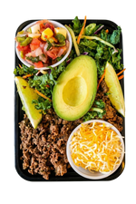 Fuel your day with our Keto Meal, featuring seasoned ground beef, creamy avocado, fresh greens, and a side of shredded cheese and pico de gallo. A low-carb, high-flavor option crafted to keep you satisfied and on track.